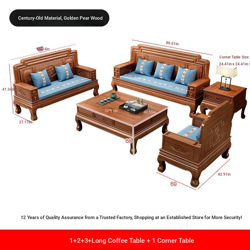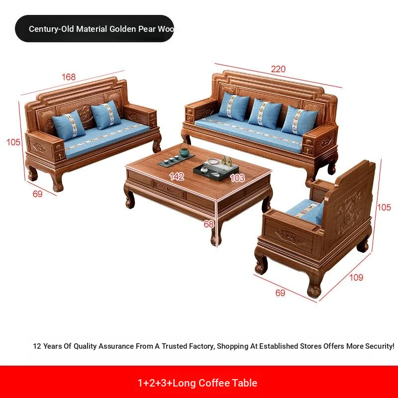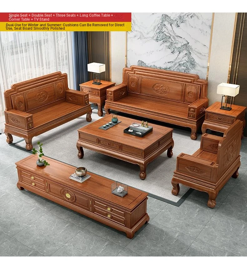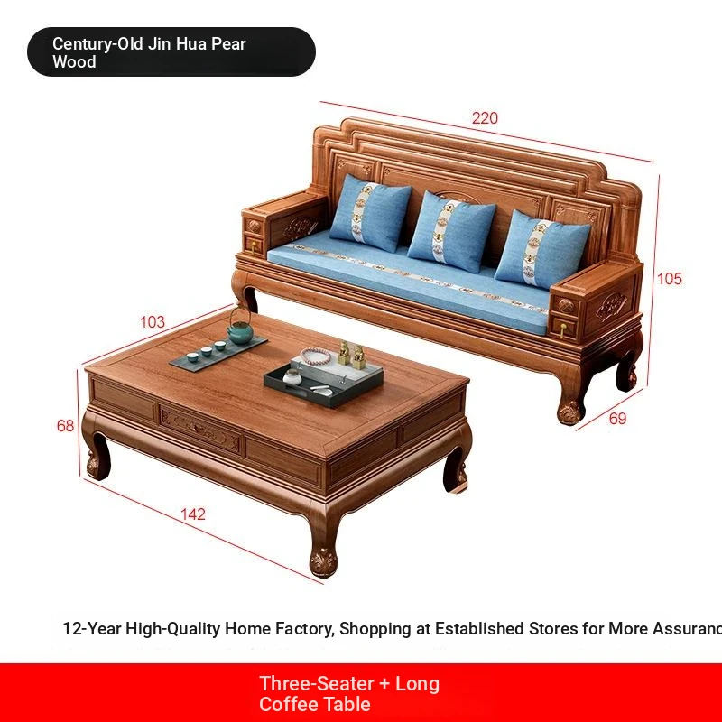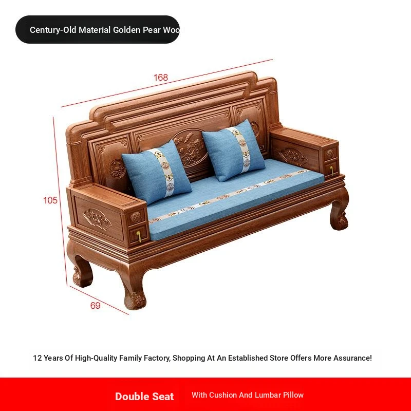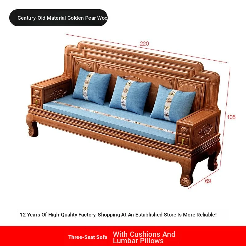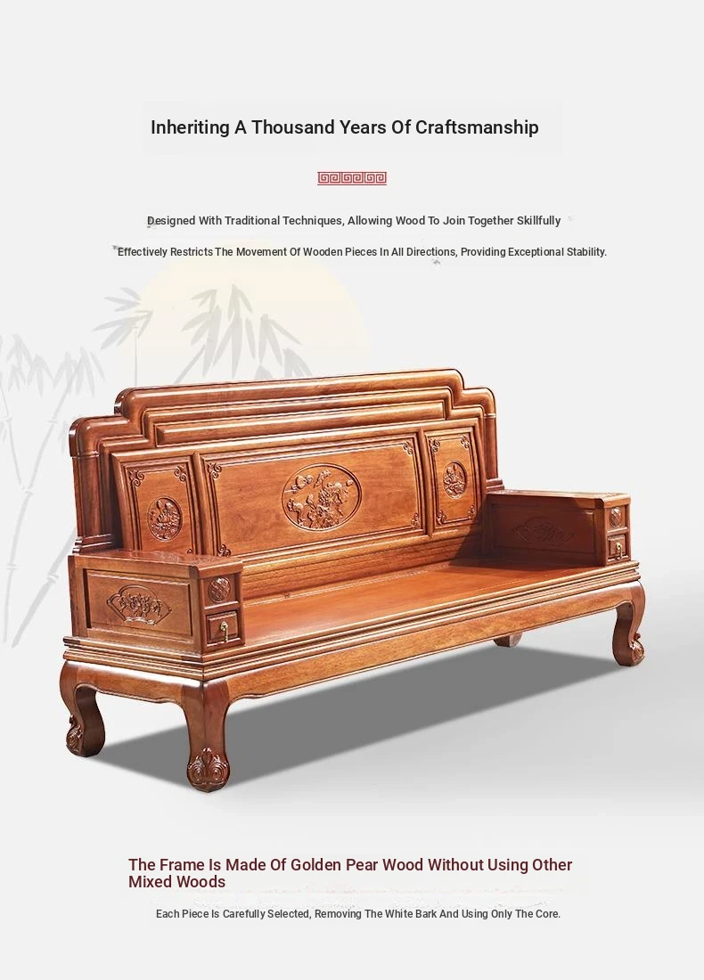 New Chinese Style Golden Pear Wood Fully Assembled Mortise and Tenon Structure Dual-Use Solid Wood Sofa with Carved Pineapple Pattern for Living Room Furniture