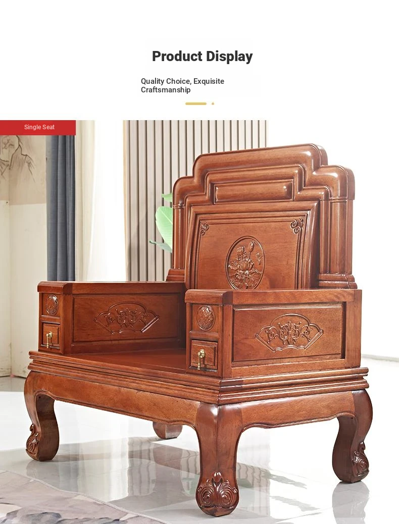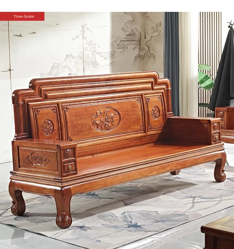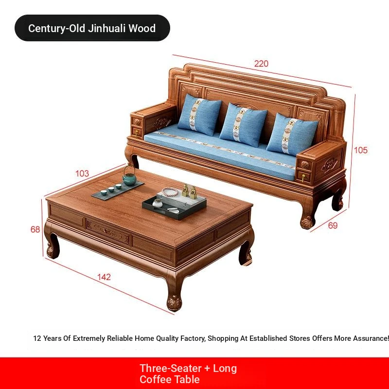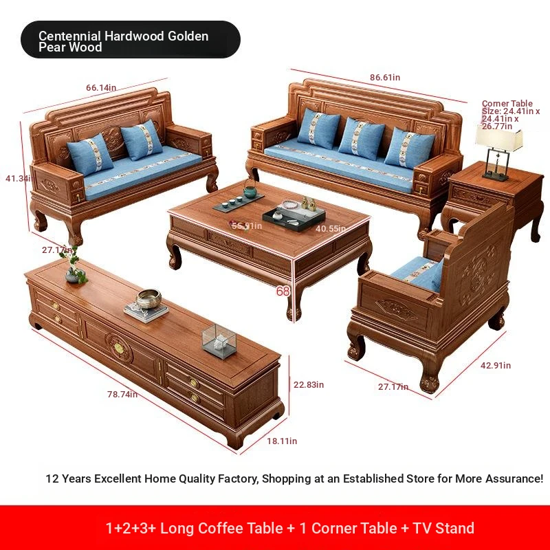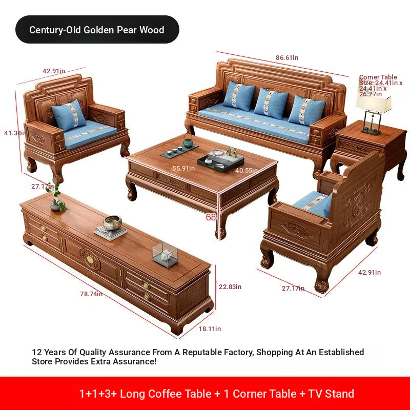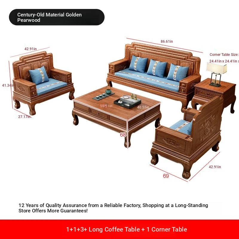 New Chinese Style Golden Pear Wood Fully Assembled Mortise and Tenon Structure Dual-Use Solid Wood Sofa with Carved Pineapple Pattern for Living Room Furniture