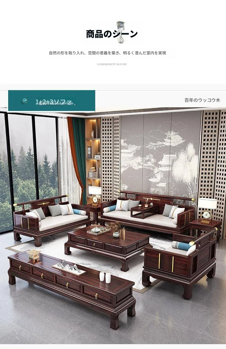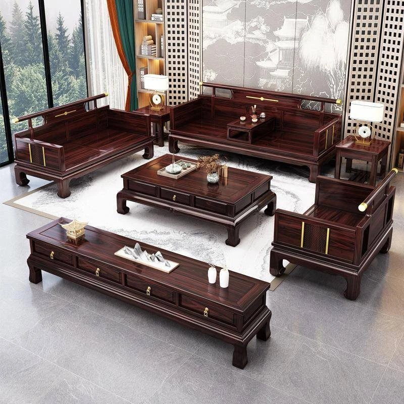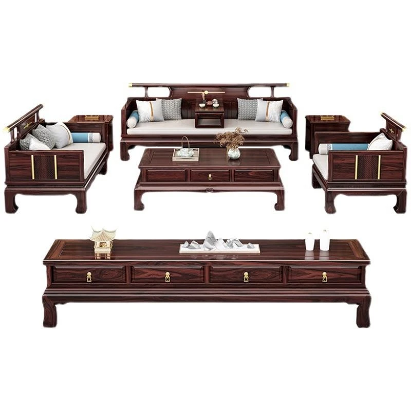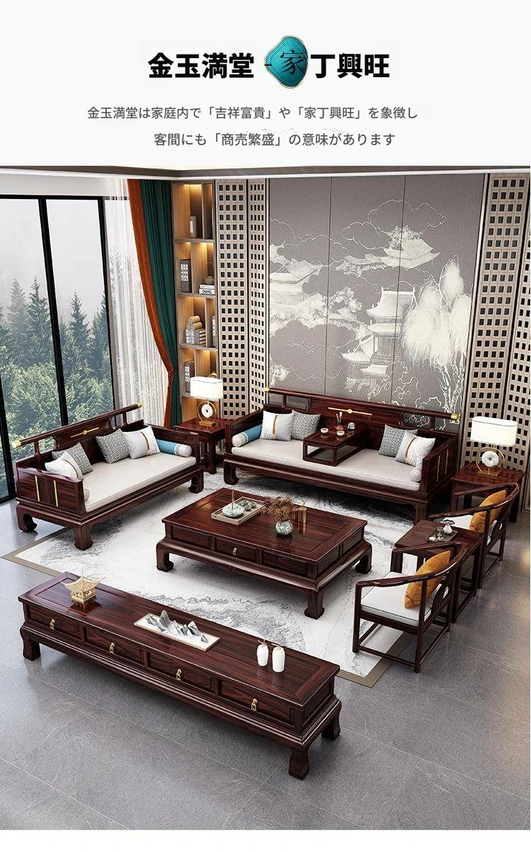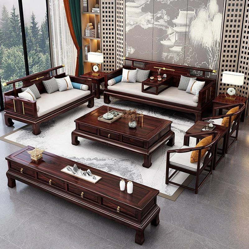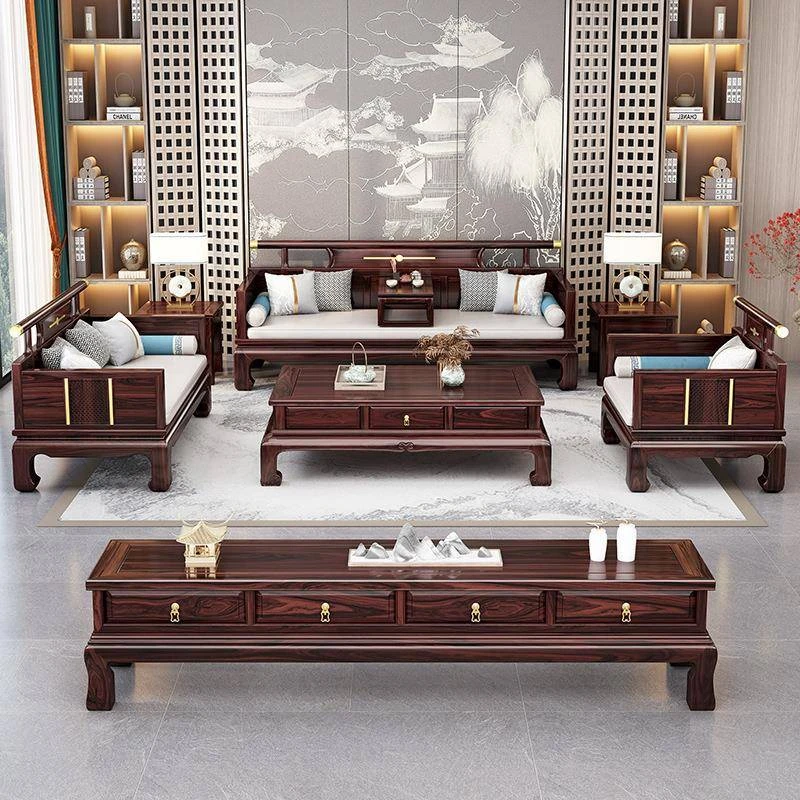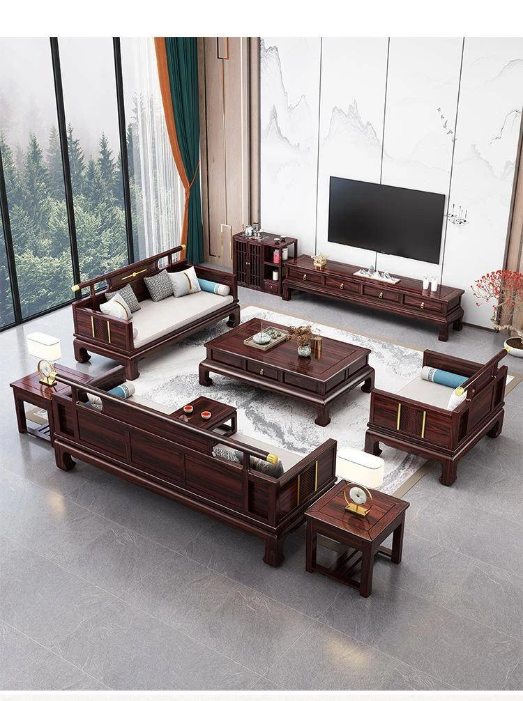 新中式ウッドブラックソファー 冬夏兼用のコンビネーション アンティーク彫刻 小型住宅向け フルオーク材のリビングルーム用フルセット家具