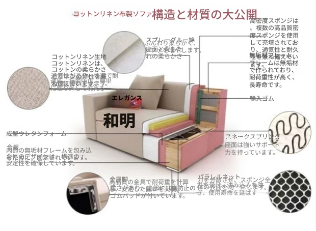 梵辰の和風ファブリックソファ - 小型リビングにぴったりな2人掛け・3人掛け、無垢材とアイアンのシンプルでモダンなコンビネーション家具!おしゃれで快適な空間を演出します。