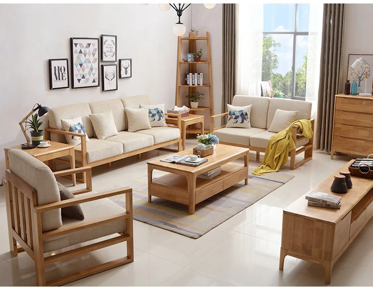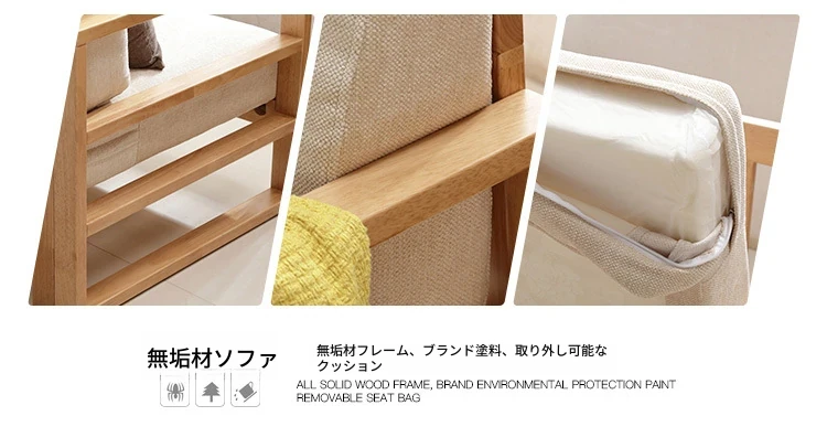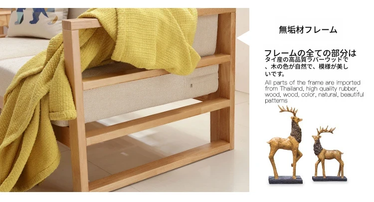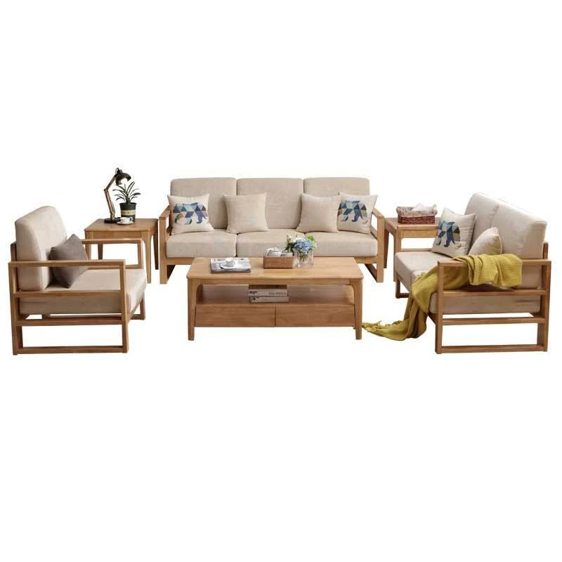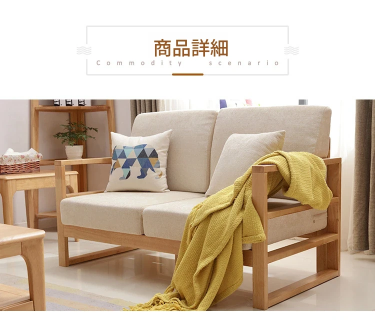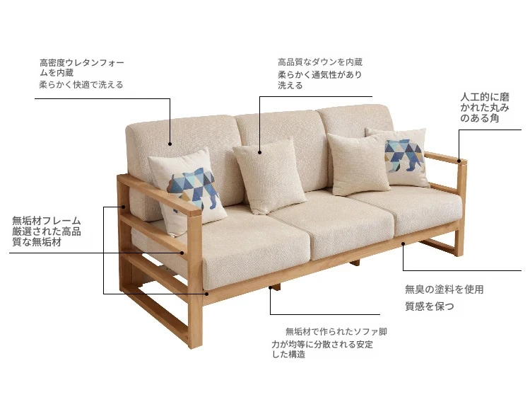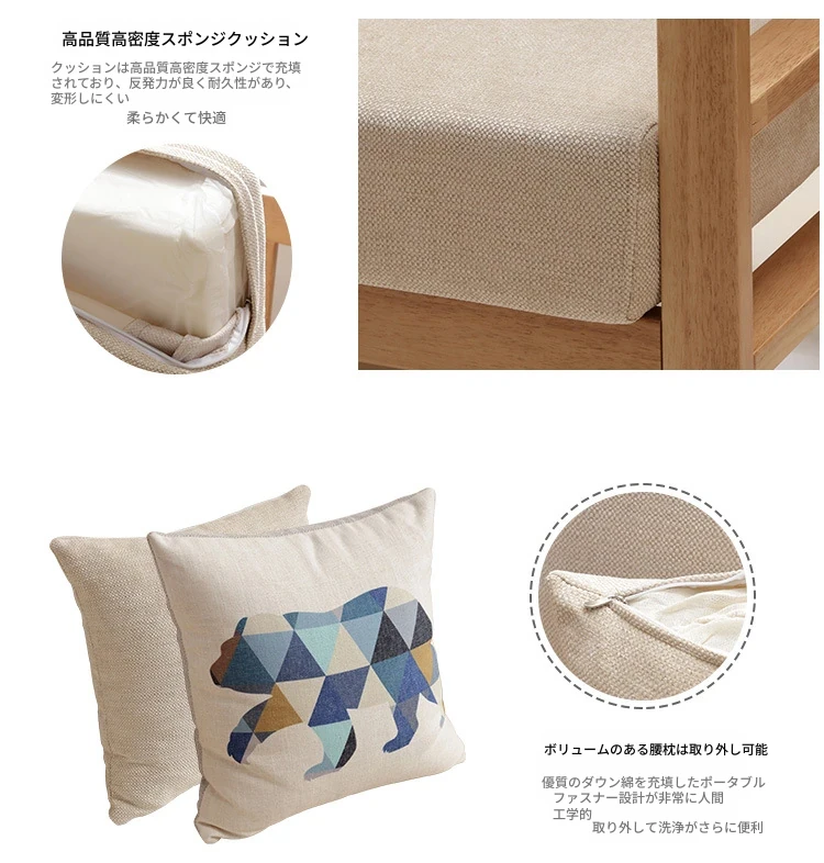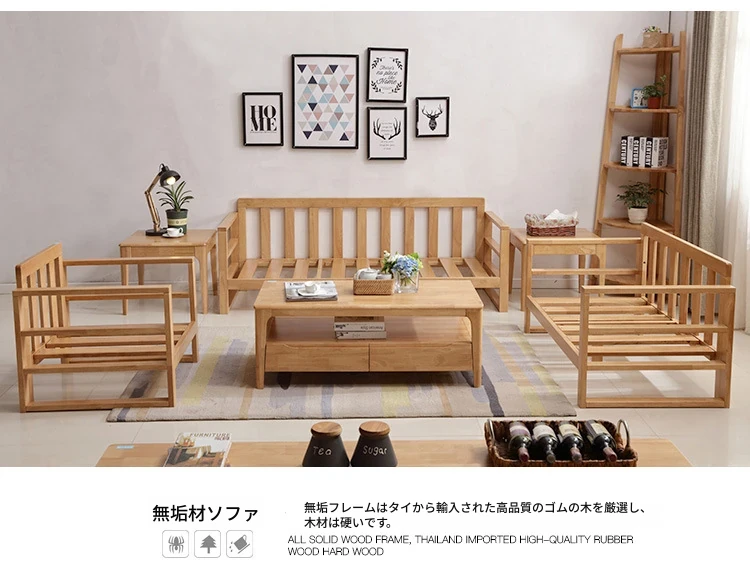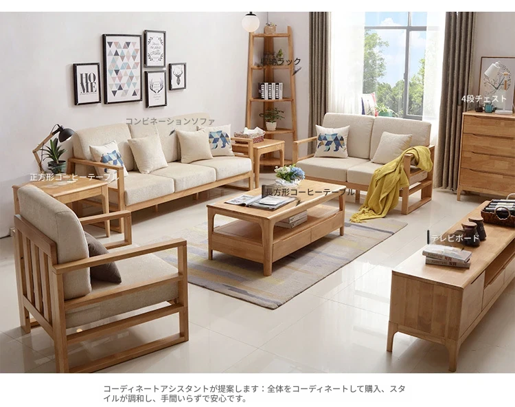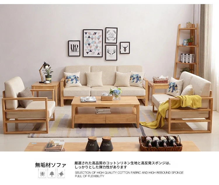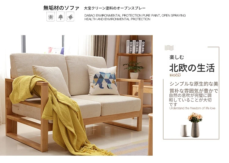 北欧風シンプルデザインの全木製ソファセット - 小型住宅に最適!高品質ファブリック使用のリビングルーム用ソファとコーヒーテーブルの組み合わせで、快適な空間を演出します。