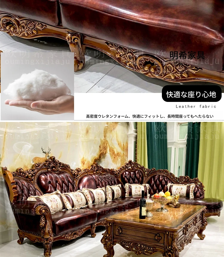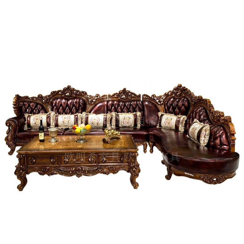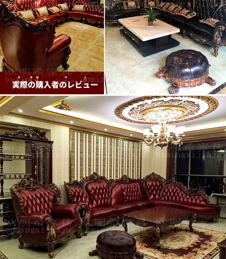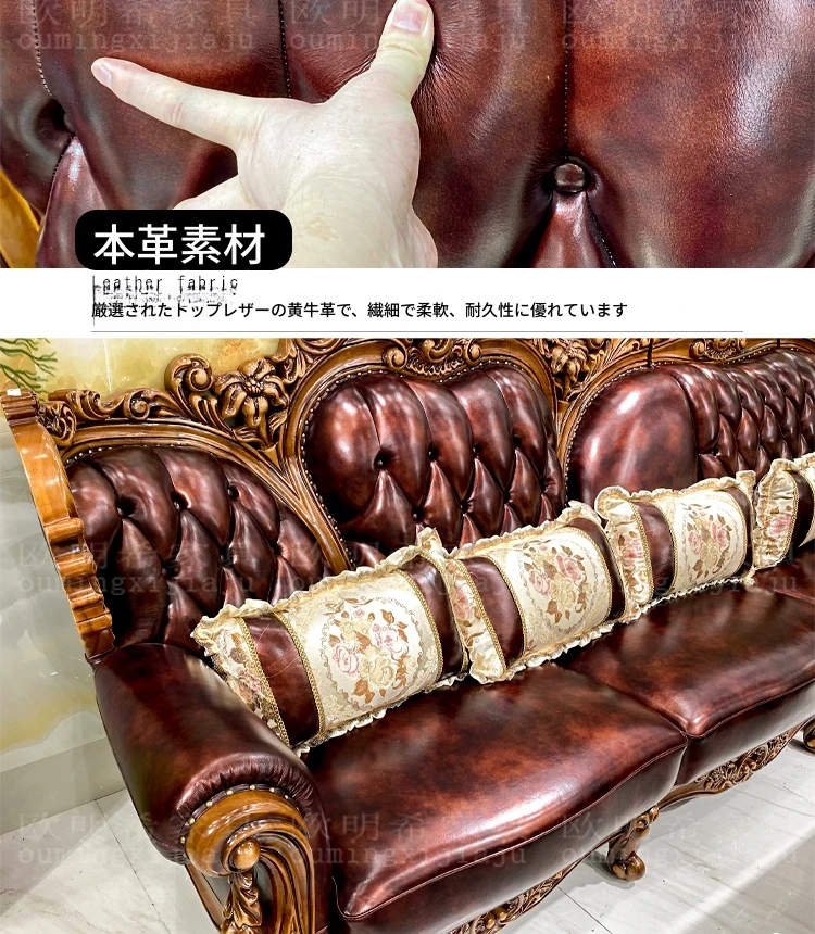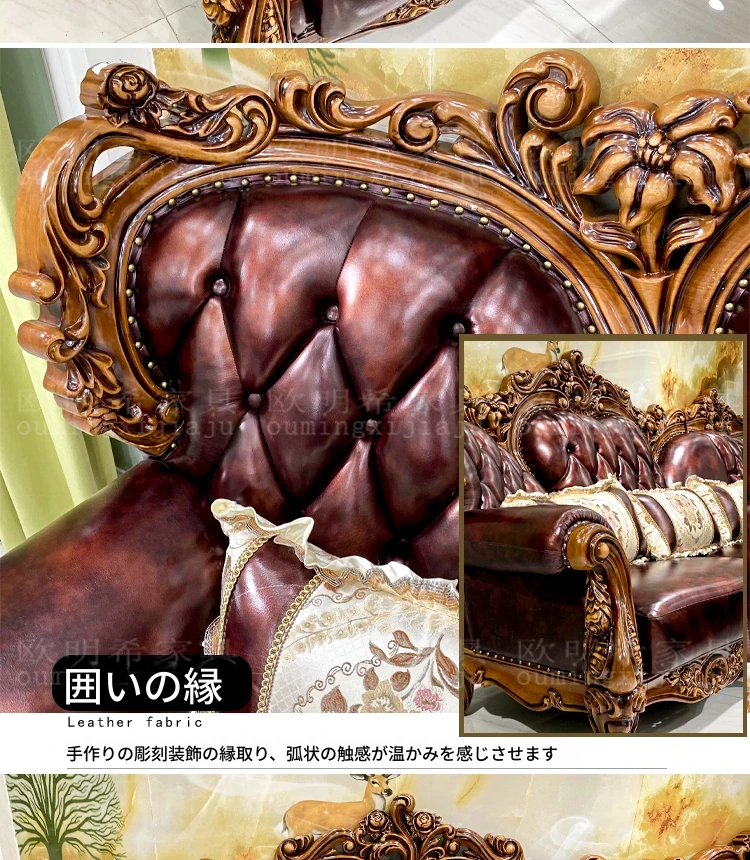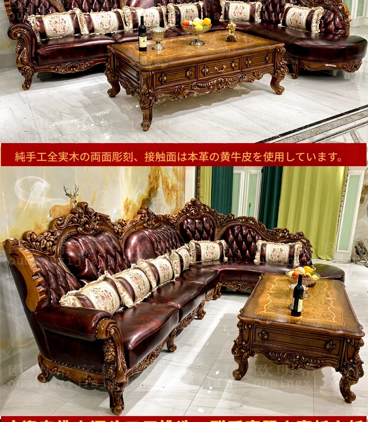 オーミンシー欧式コーナーソファ 本革 リビングルーム用コンビネーション フェイスタイプ 小型住宅に最適!全て天然木製 ヴィラ向け高級家具で、洗練された空間を演出します。
