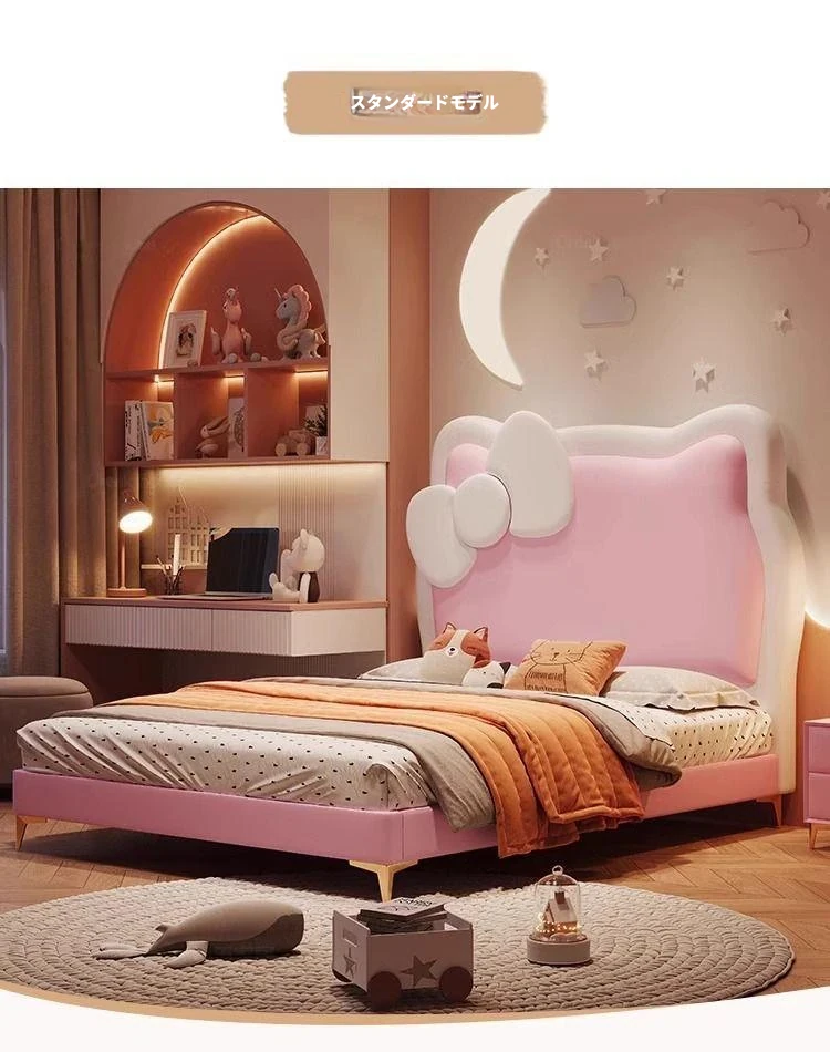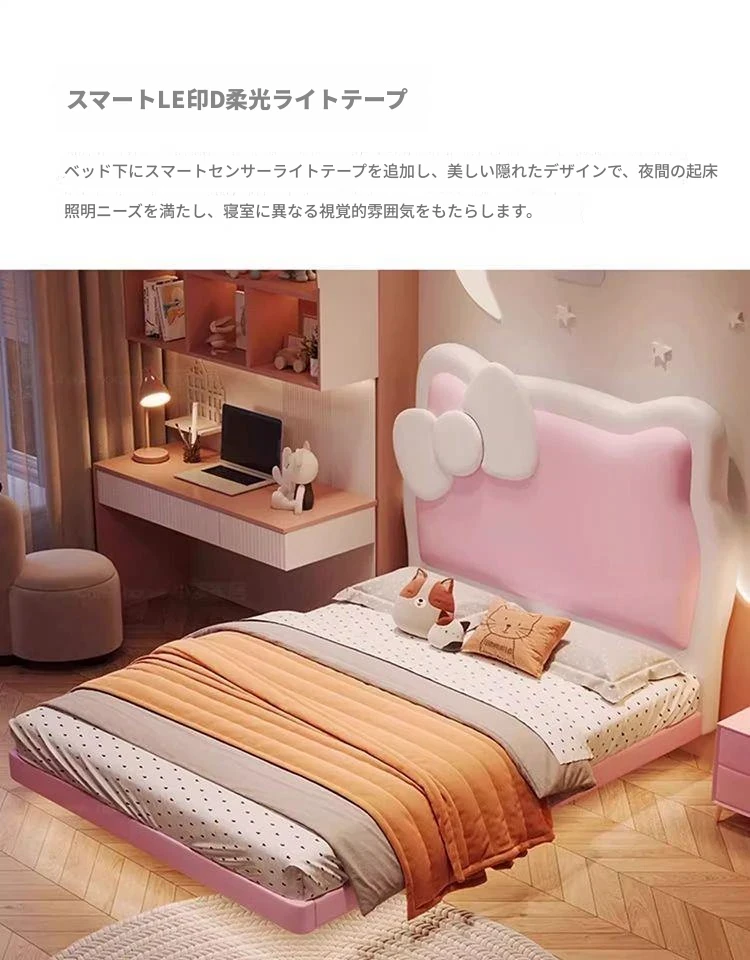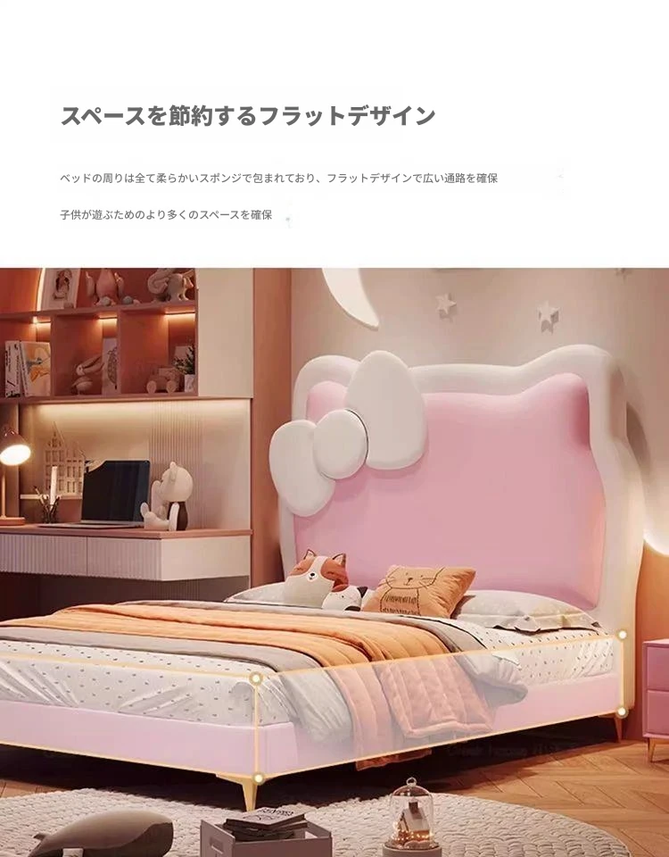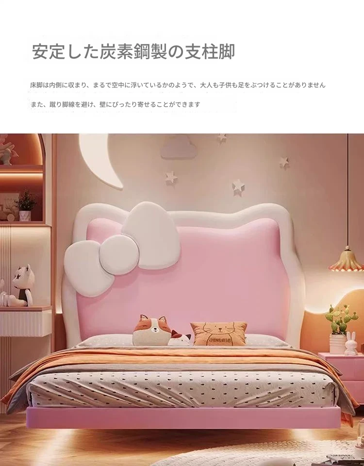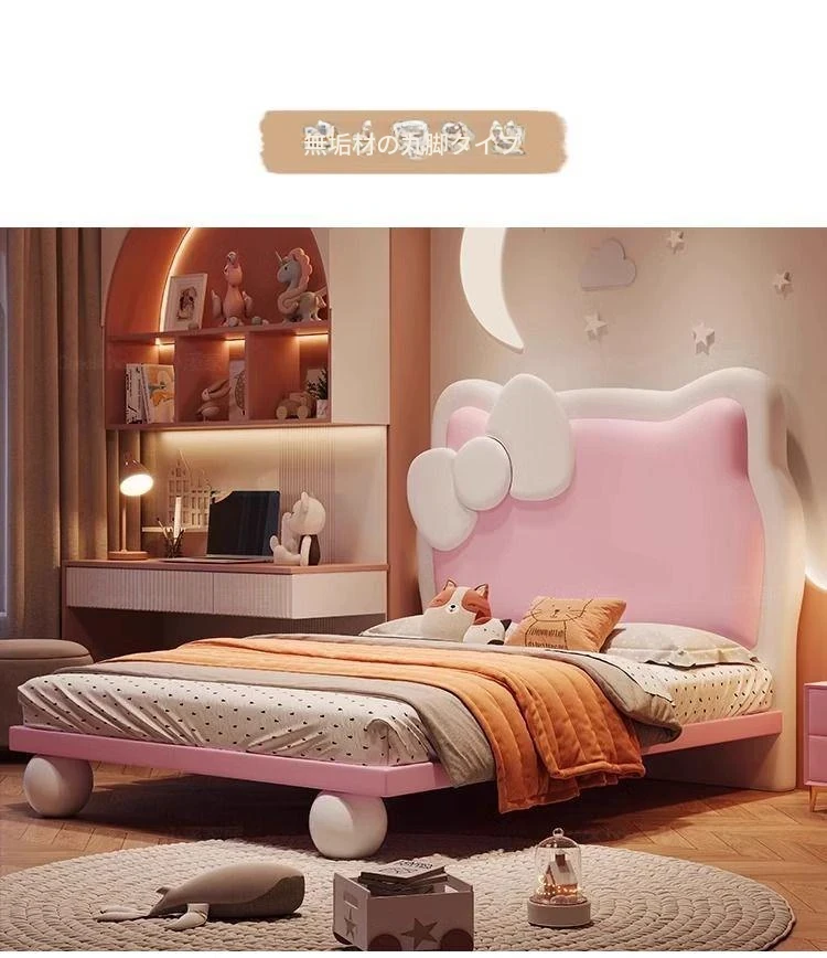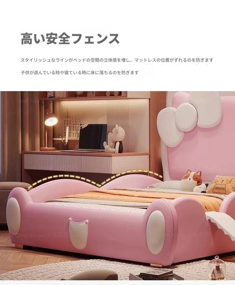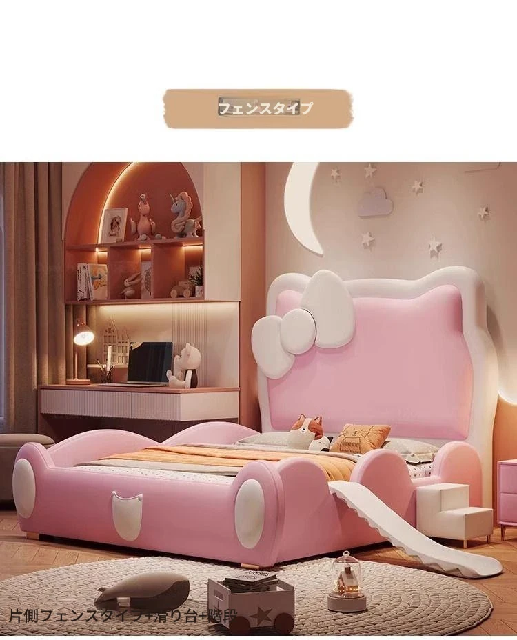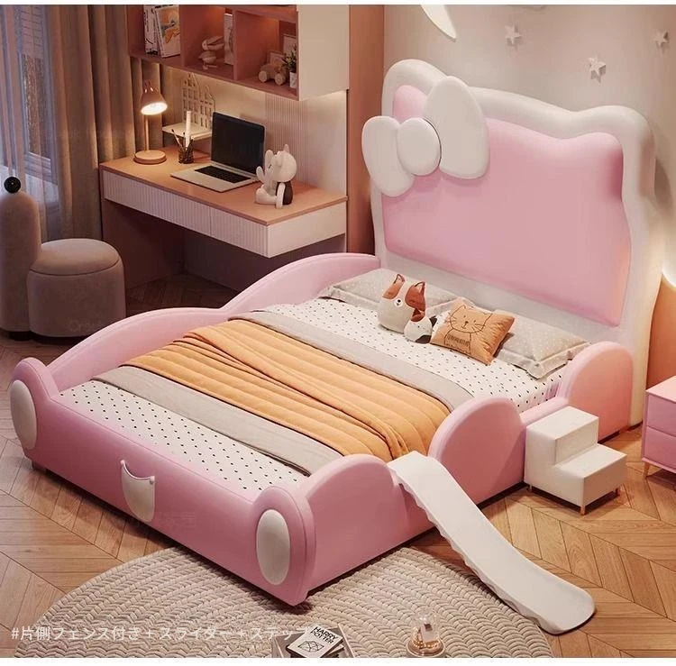 女の子のための可愛いプリンセスベッド!1.5mの天然木製シングルベッド、ピンクのキティ猫スライド付きで、可愛らしいキャラクターと安全なガードレールが魅力。お子様の夢の空間を実現します!