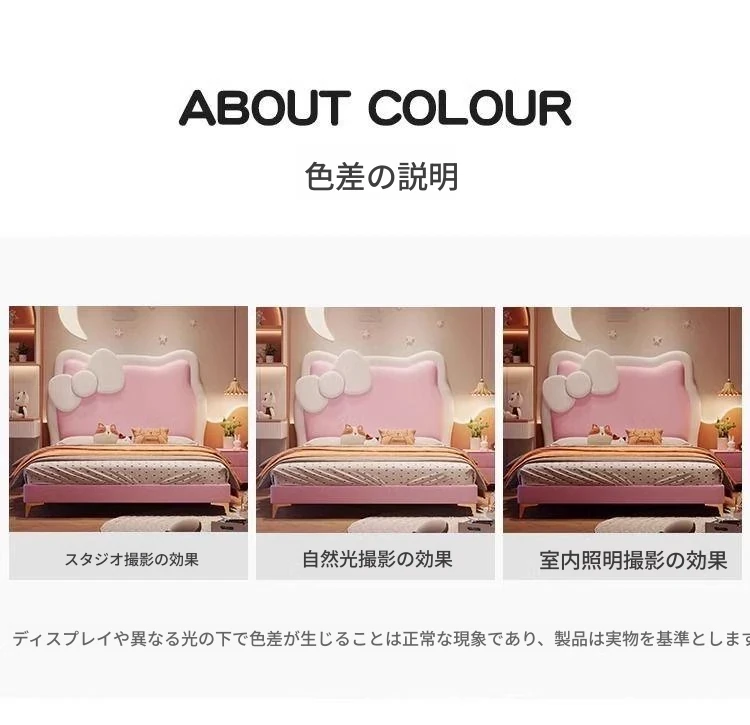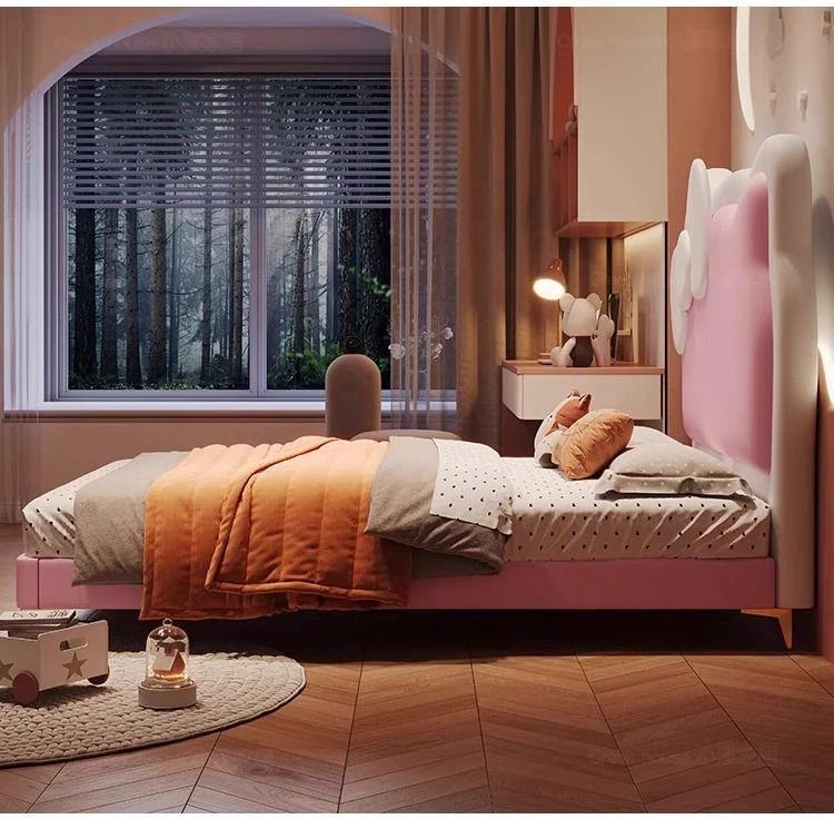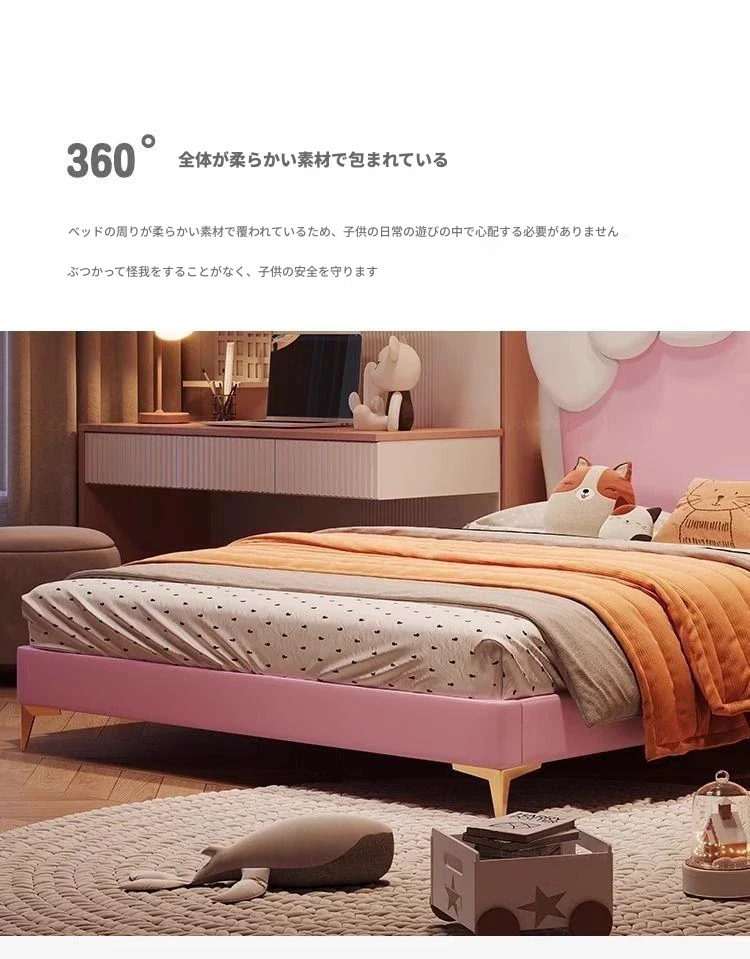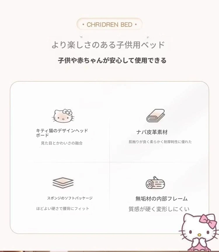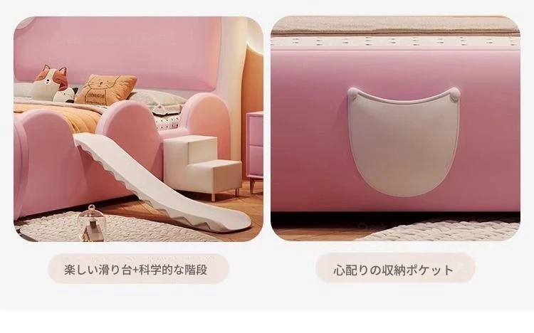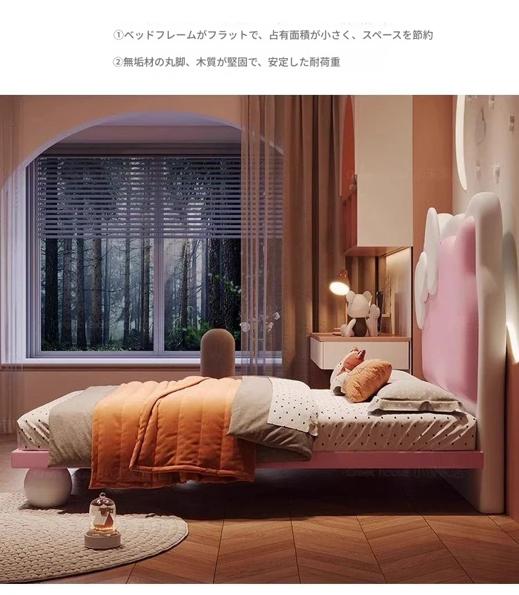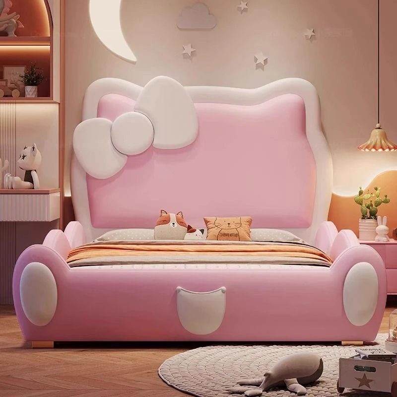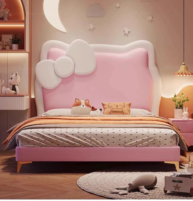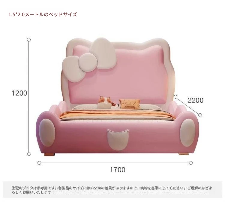 女の子のための可愛いプリンセスベッド!1.5mの天然木製シングルベッド、ピンクのキティ猫スライド付きで、可愛らしいキャラクターと安全なガードレールが魅力。お子様の夢の空間を実現します!