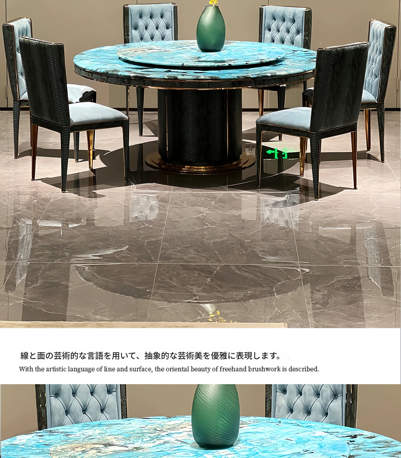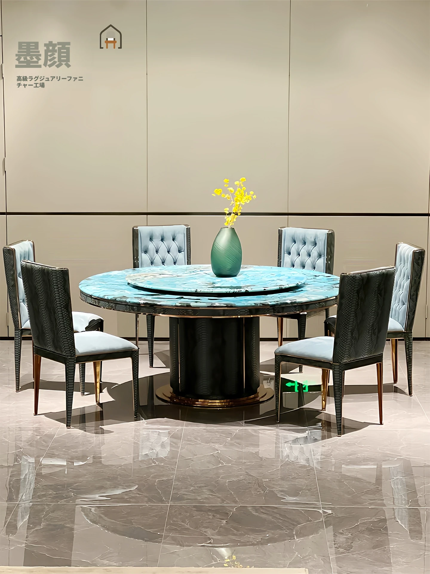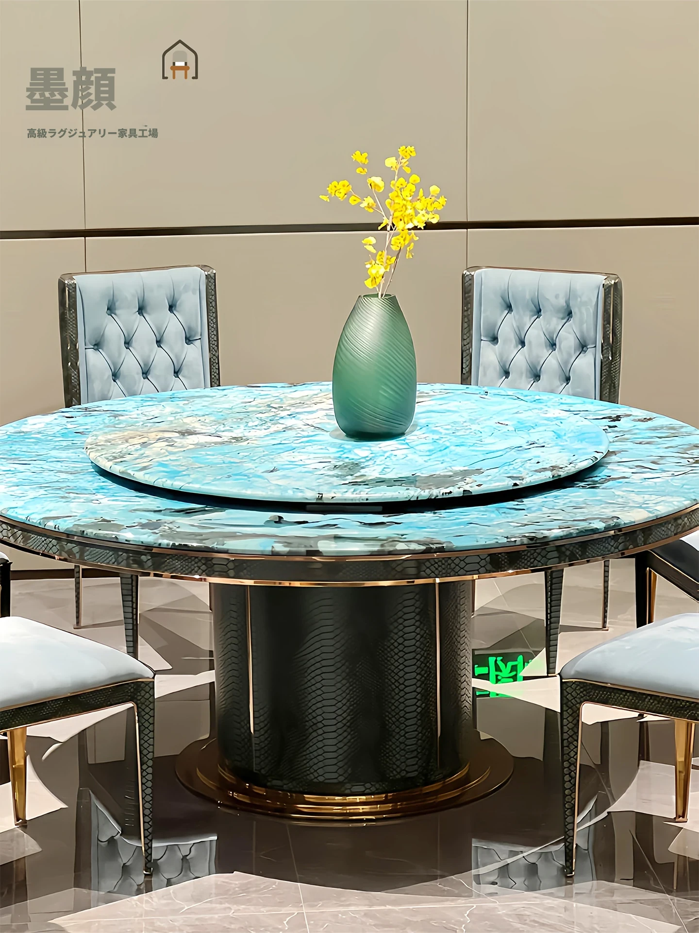 高級感溢れる大理石製ラウンドダイニングテーブル - 家庭用、別荘向けの美しいブルージェイド天然石製、6人用のスタイリッシュな椅子セット付き!食事のひとときを特別に演出します。