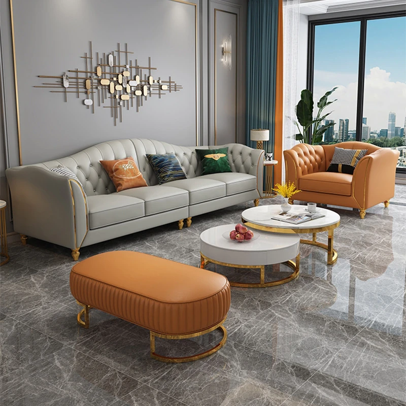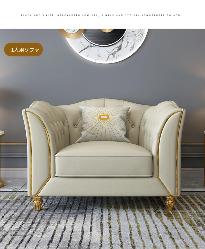 香港スタイルのラグジュアリーサンプルルーム!シングル、ダブル、トリプル対応の高品質レザーとファブリックのソファ。イタリアンデザインのリビングにぴったりのステンレスゴールド仕上げ!快適さとエレガンスを両立した空間を演出します。
