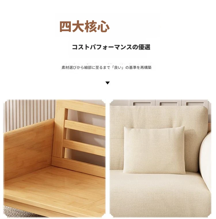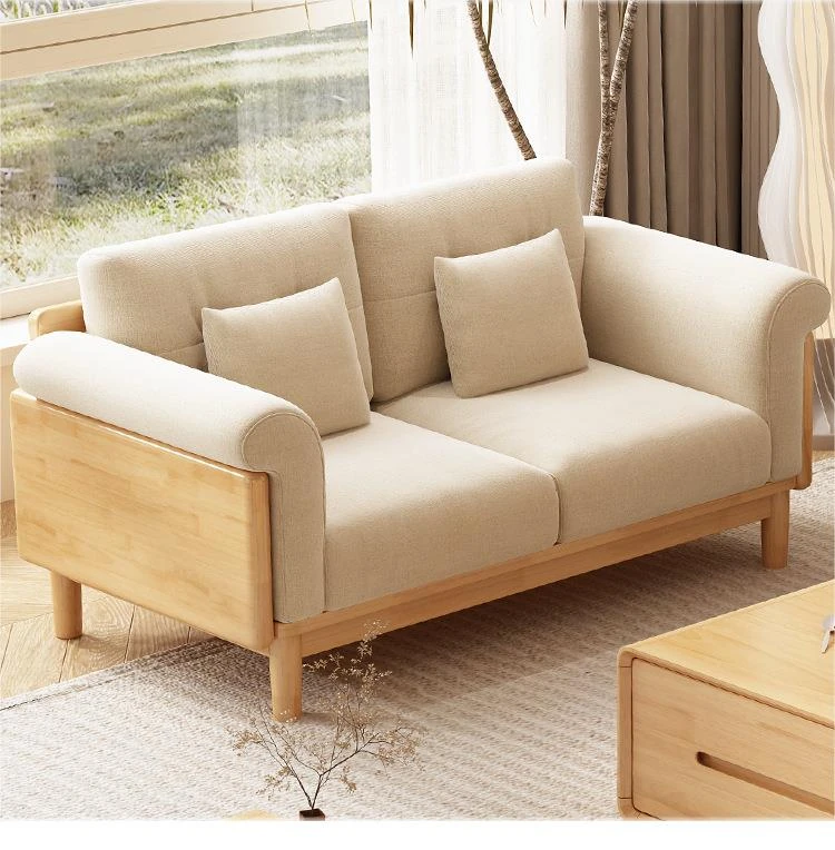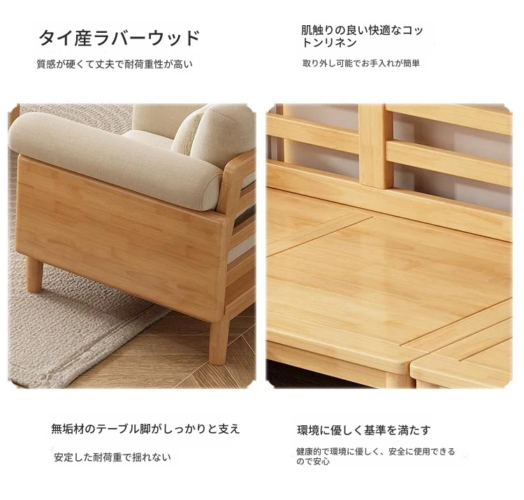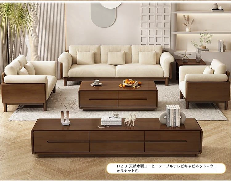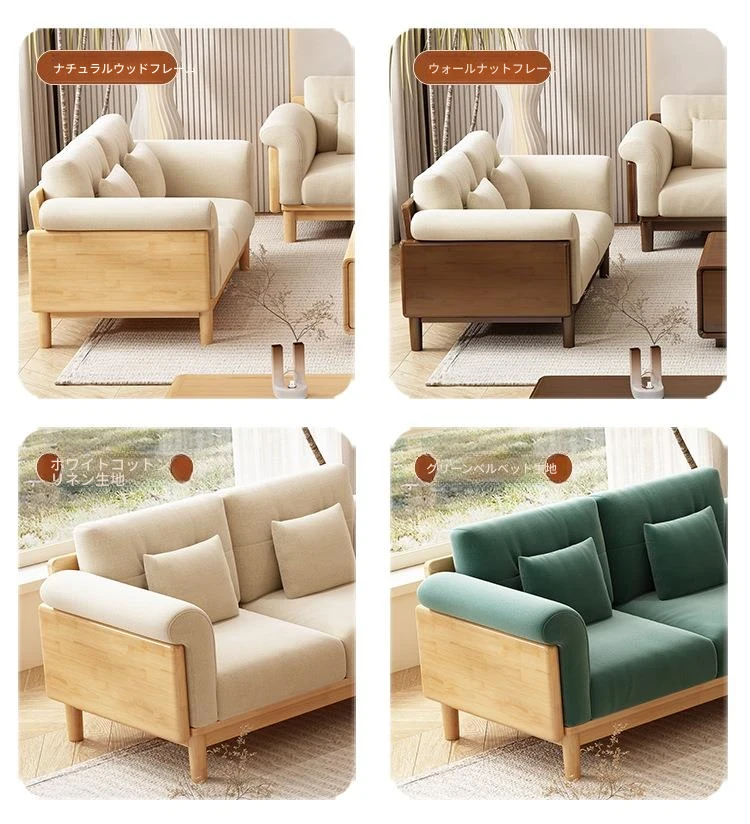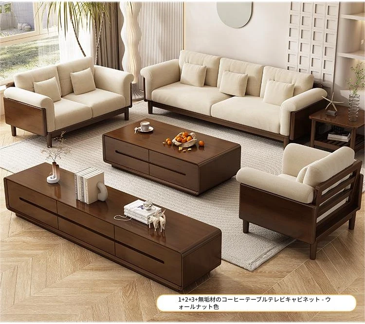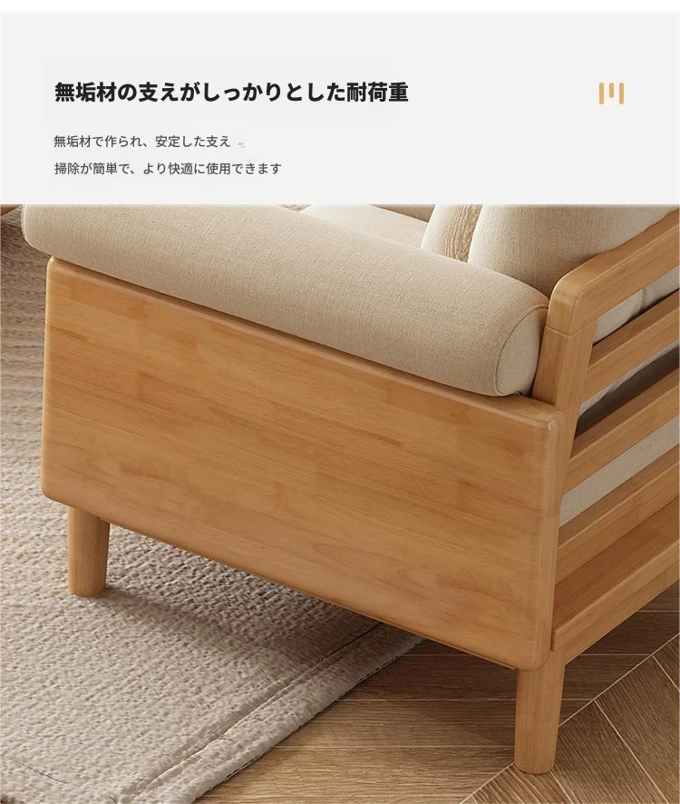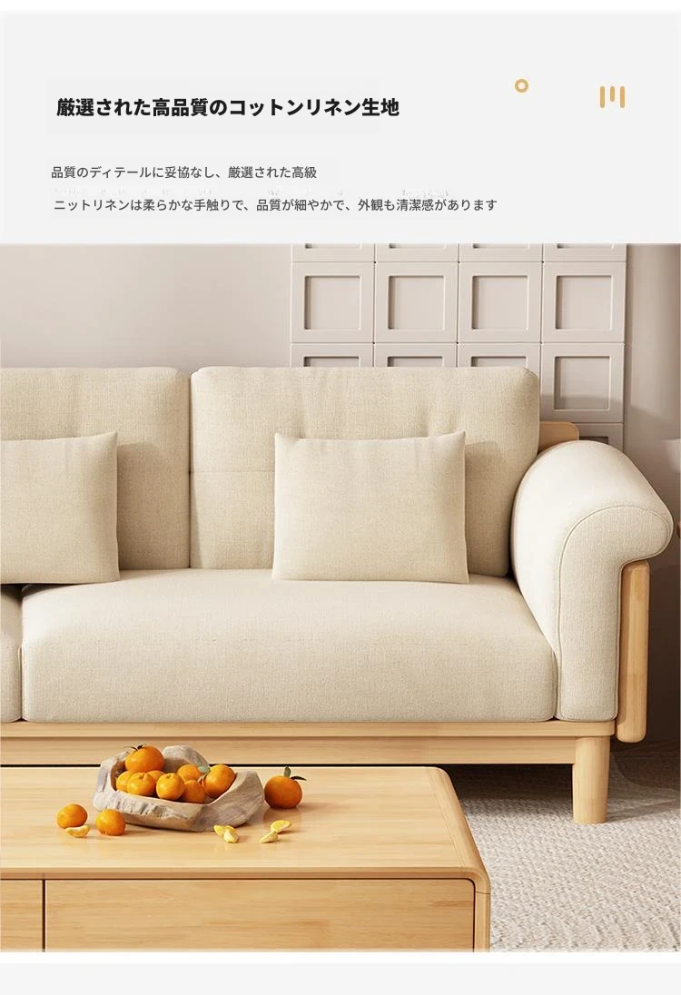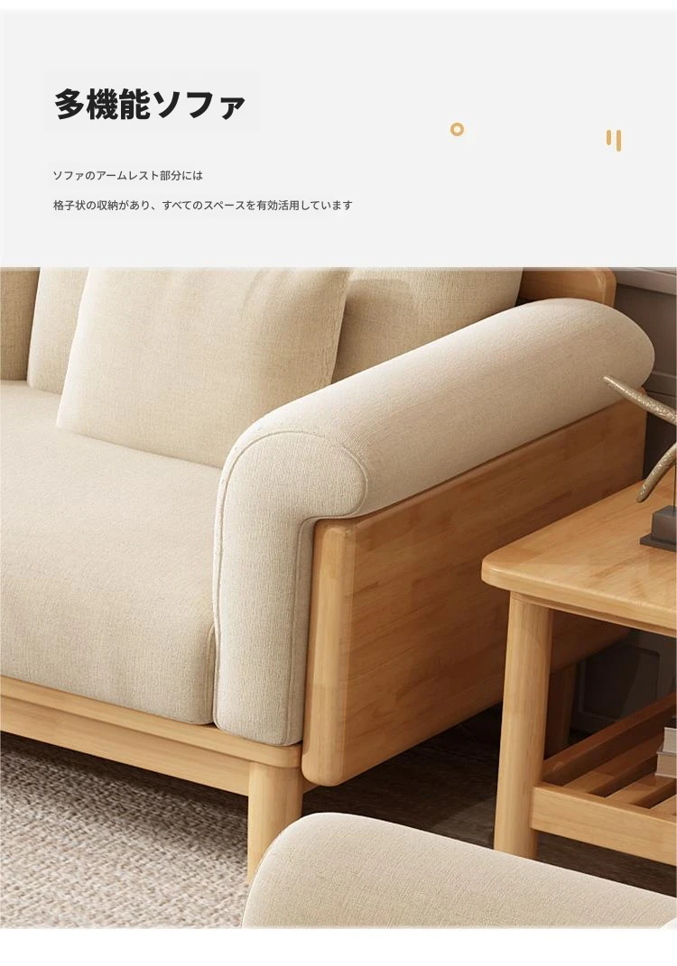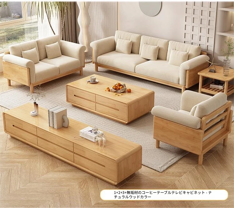 北欧スタイルの天然木製モダンソファ!シンプルでおしゃれな小型リビングにぴったり。クリームカラーの和風ファブリックソファで心地よい空間を演出。家庭用に最適な家具セット!
