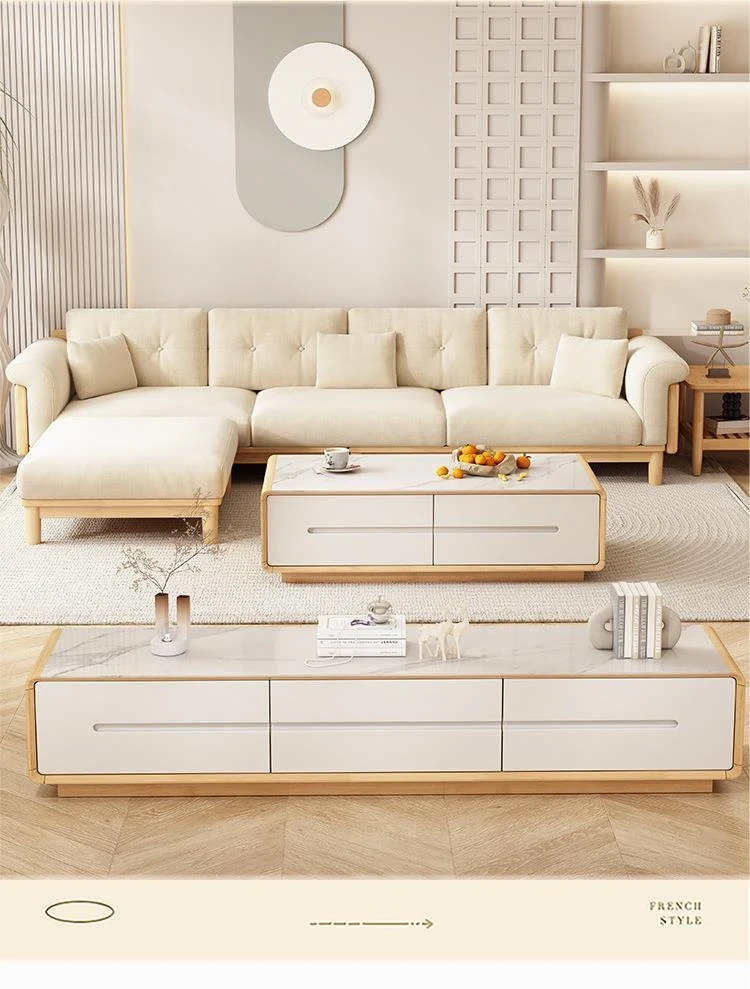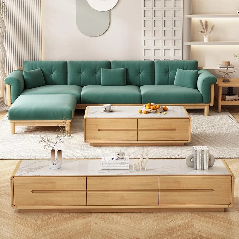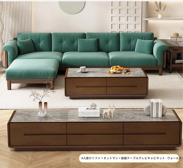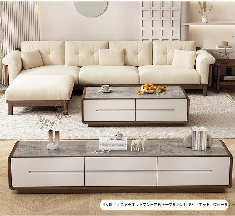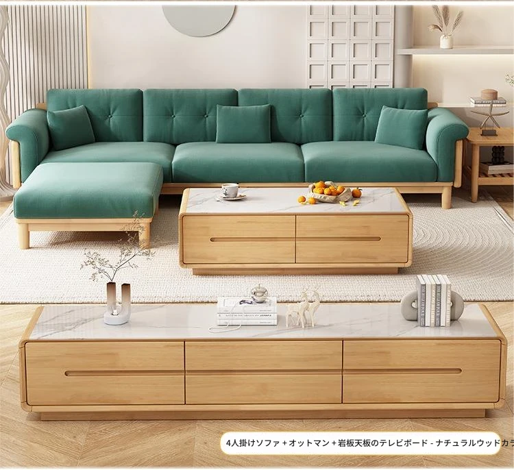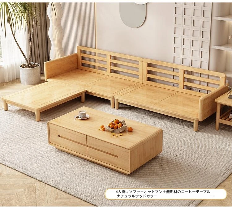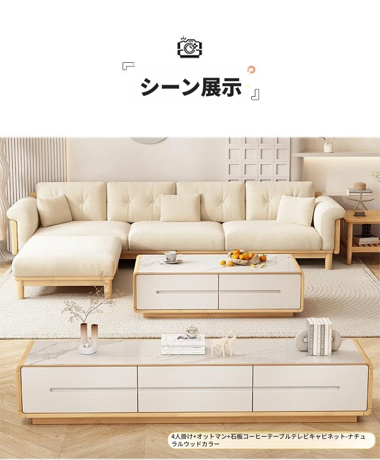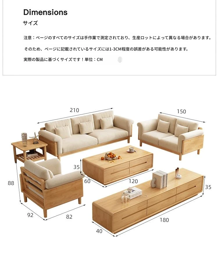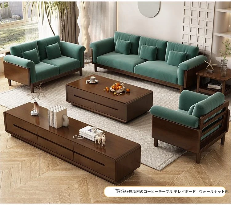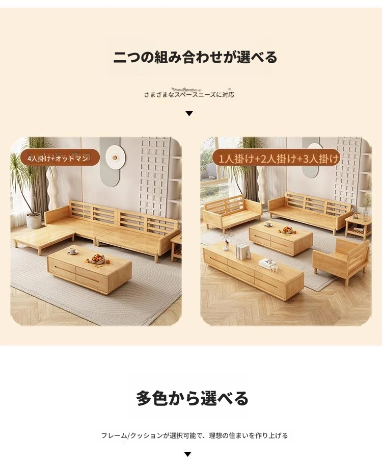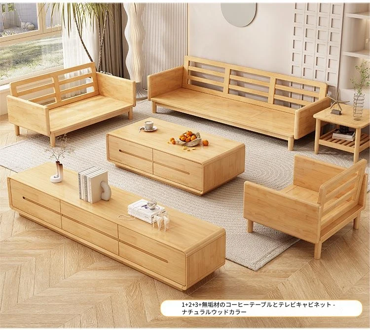 北欧スタイルの天然木製モダンソファ!シンプルでおしゃれな小型リビングにぴったり。クリームカラーの和風ファブリックソファで心地よい空間を演出。家庭用に最適な家具セット!
