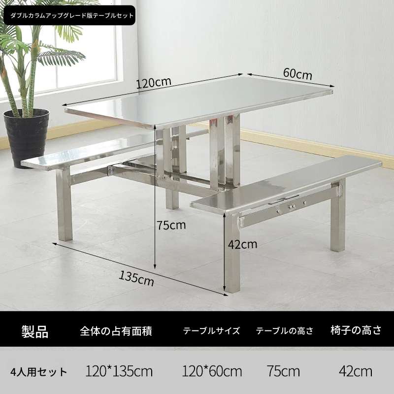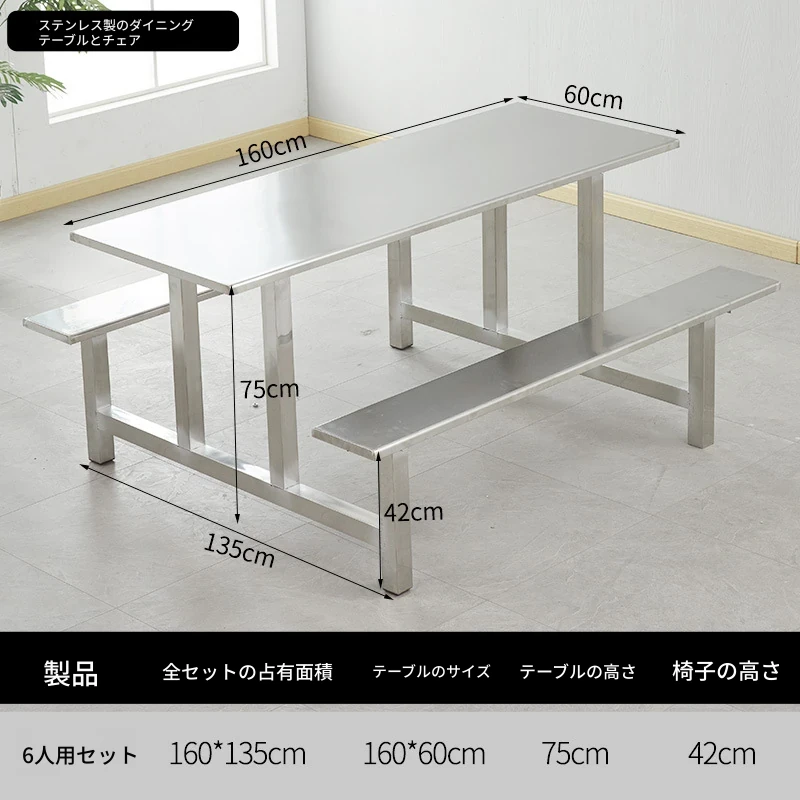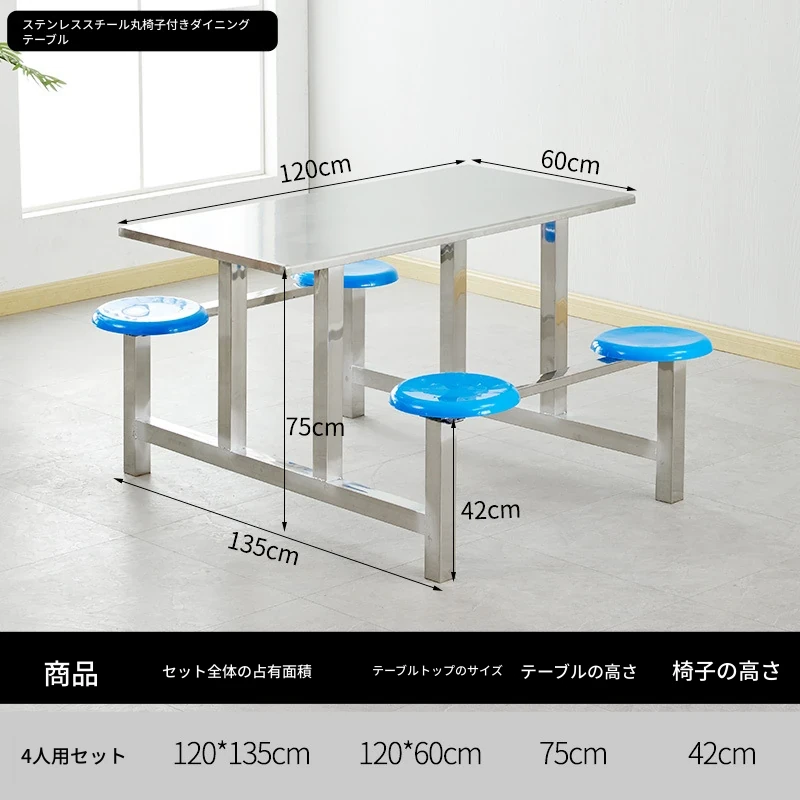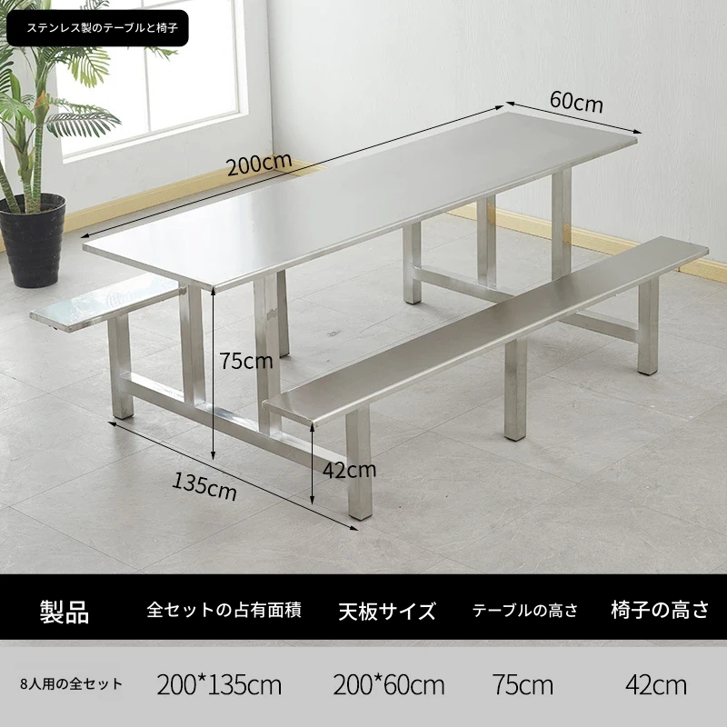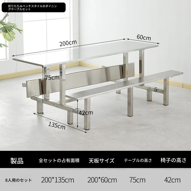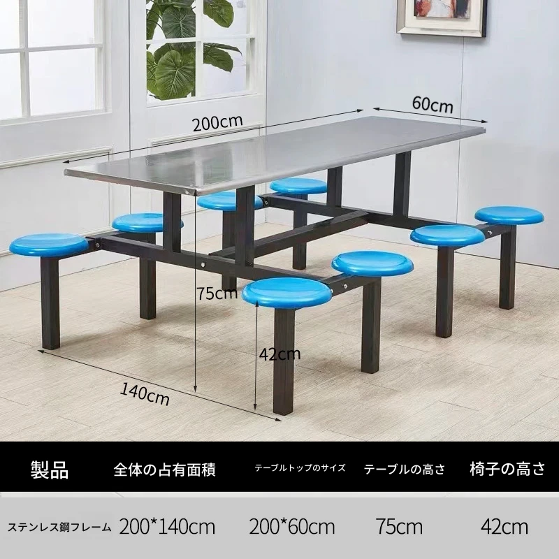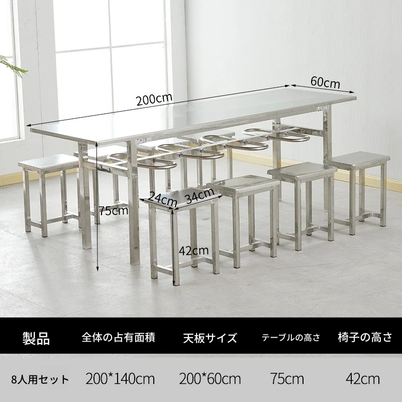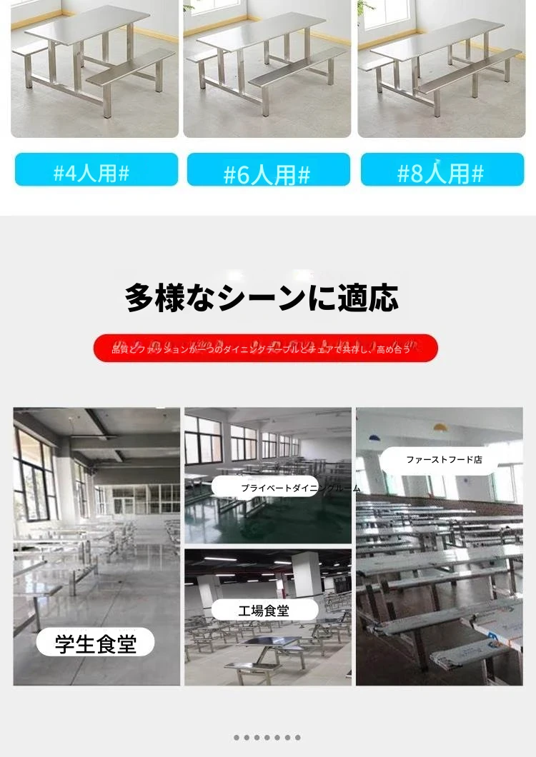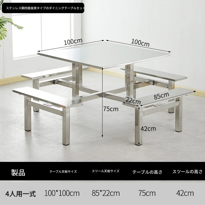 ステンレス製シンプル一体型食堂テーブル&チェアセット - 学校や工場に最適!4人用・8人用の連結デザインで、学生やスタッフの皆様に快適な食事空間を提供します。高品質で耐久性抜群!