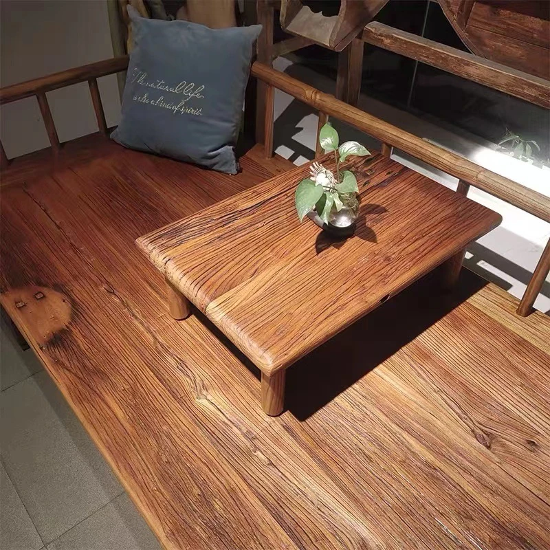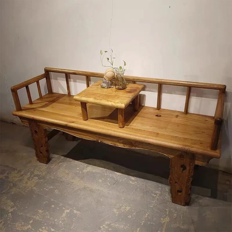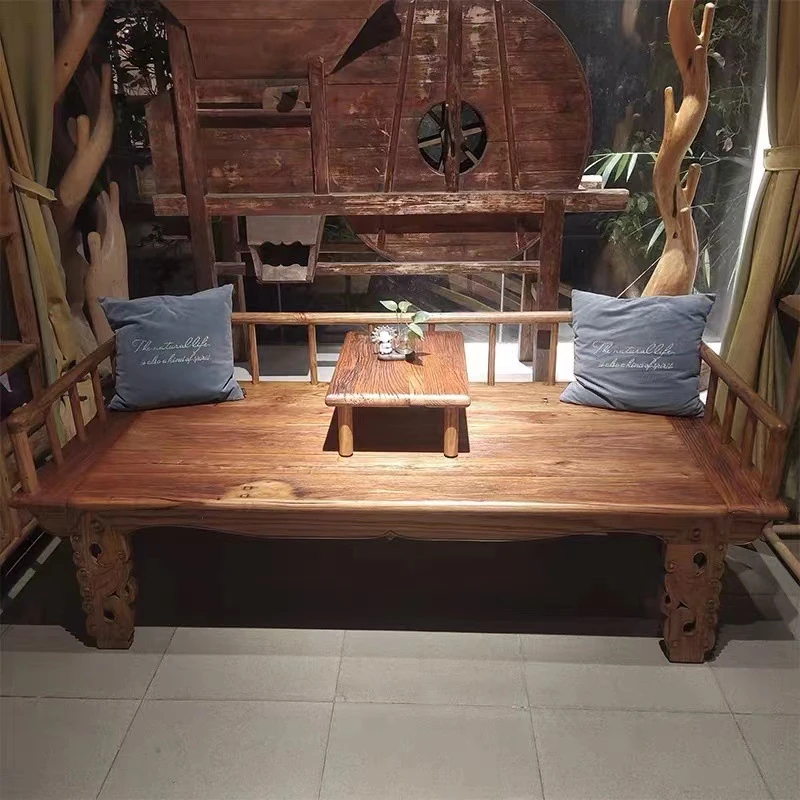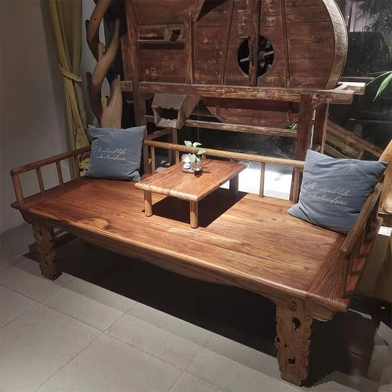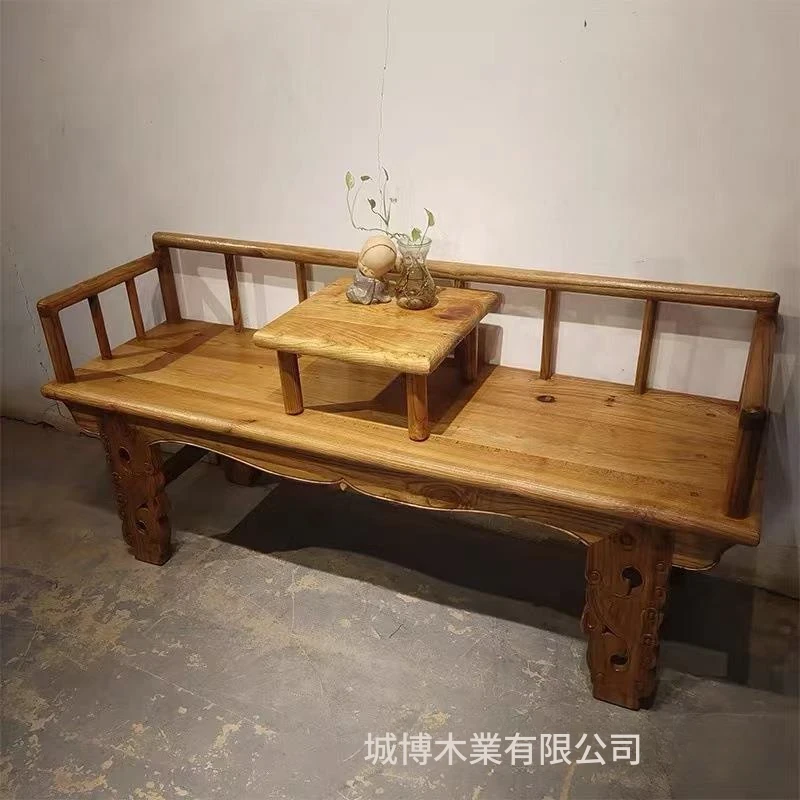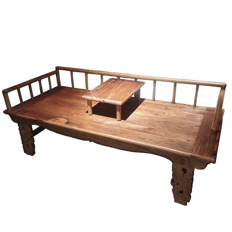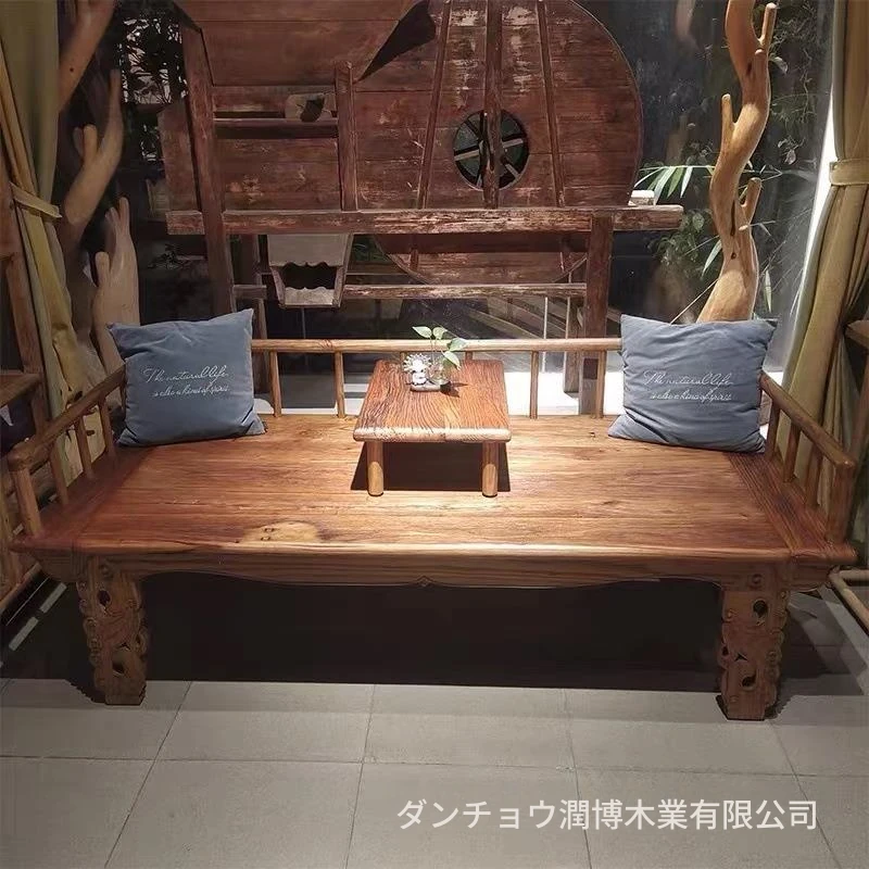新中式デザインの無垢老榆木ロハンベッド - プル式伸縮ソファベッド、レトロな小型リビングにぴったり!北方の民宿にも最適なスタイリッシュな空間を演出します。